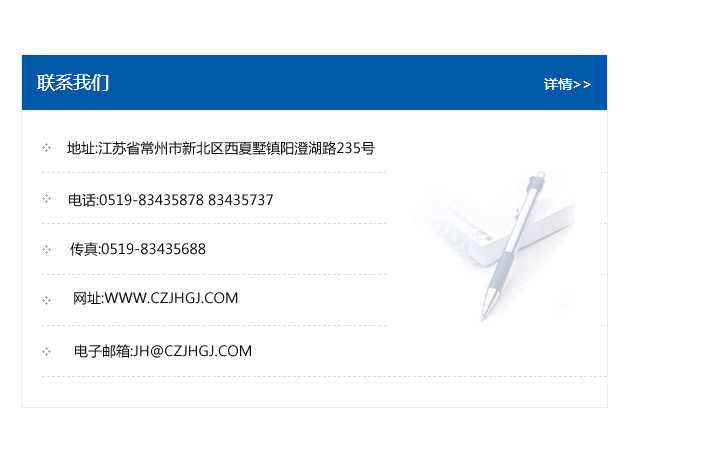 地址:常州市新北區(qū)友邦商務(wù)大廈1幢16、17層  電話:0519-85101652  傳真:0519-85112595  郵編:213022  網(wǎng)址:www_cz-jiayue_cn.cdsanjia88.com  郵箱:xiajifengaa@163.com